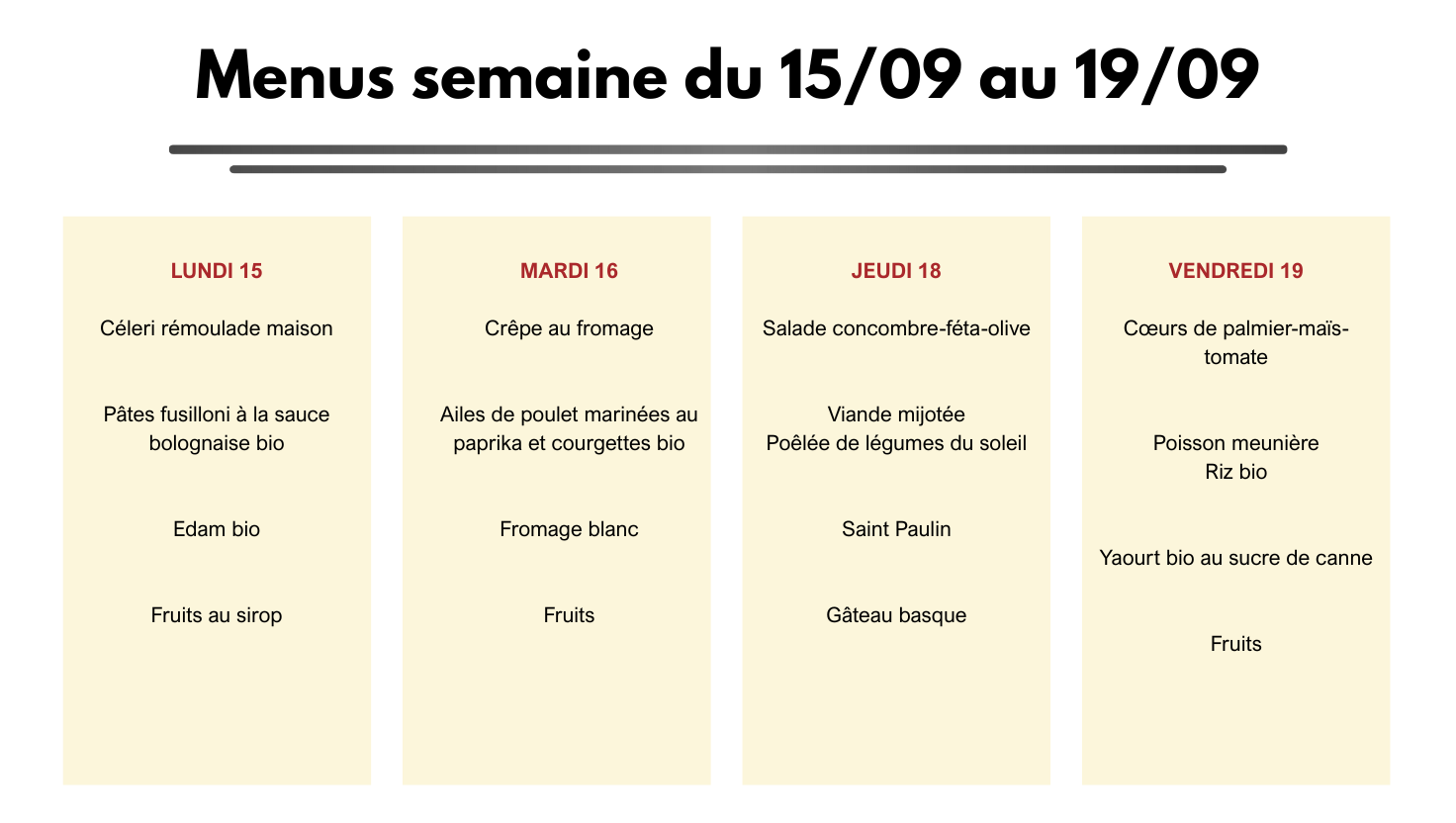 Et oui, pour cette rentrée 2025, les menus de la cantine reviennent sur le site !
